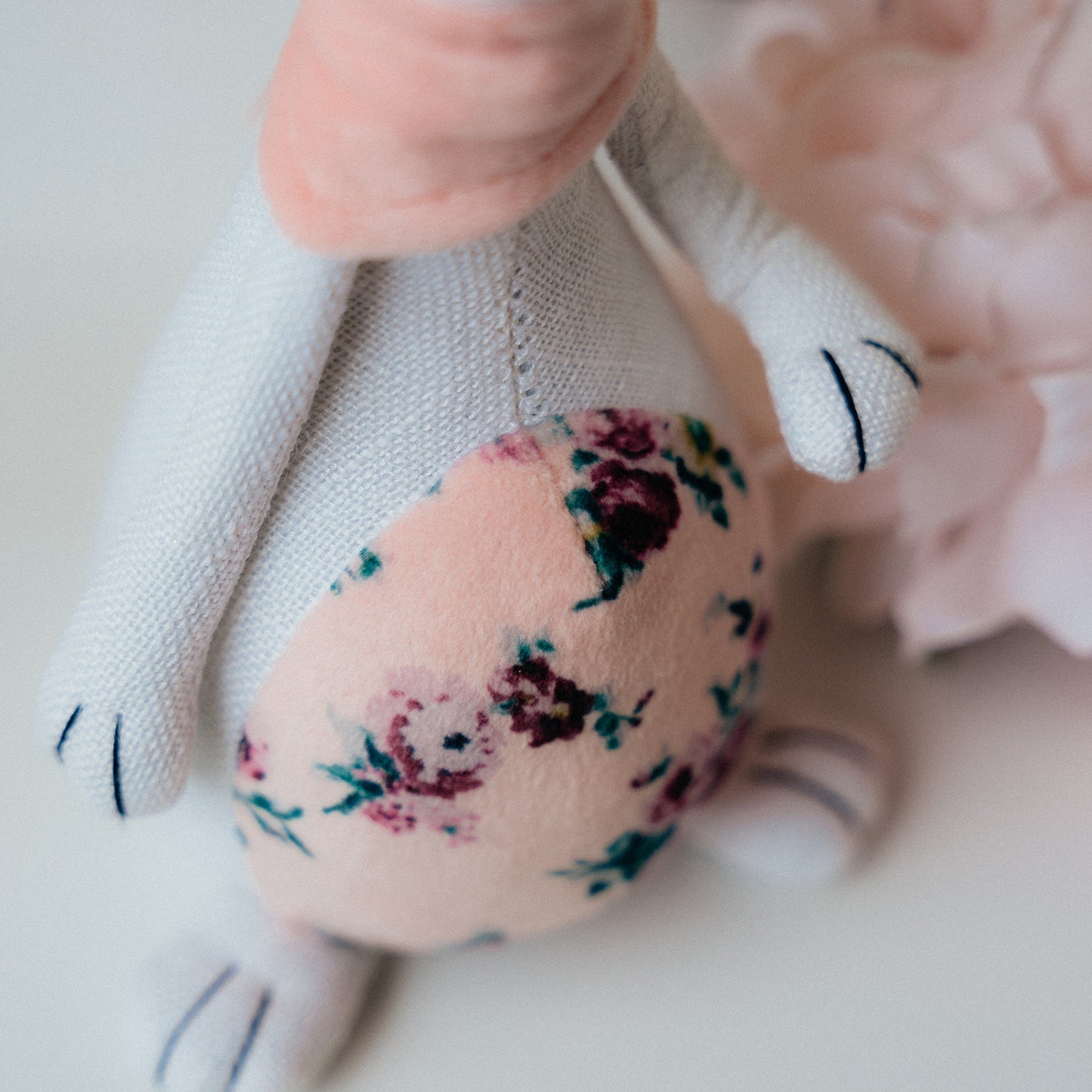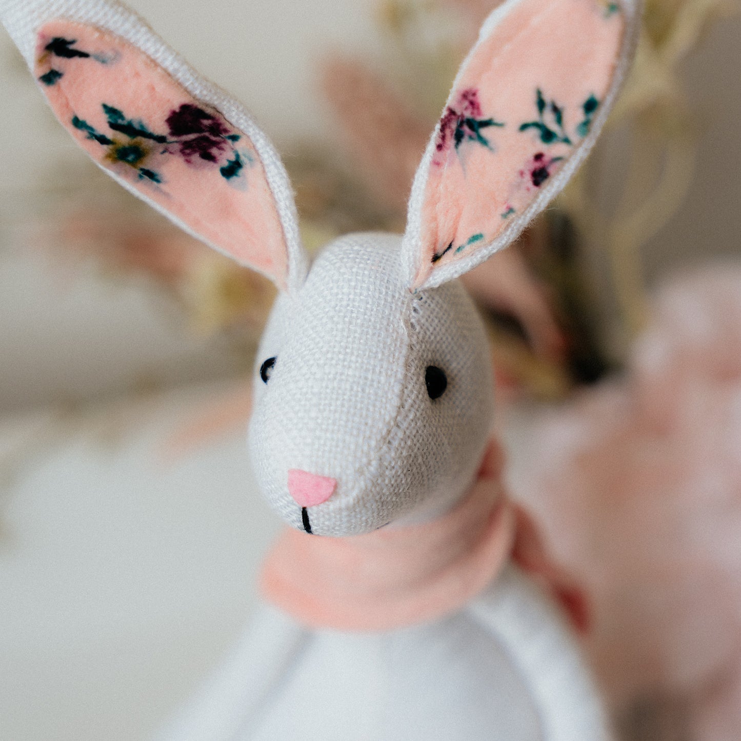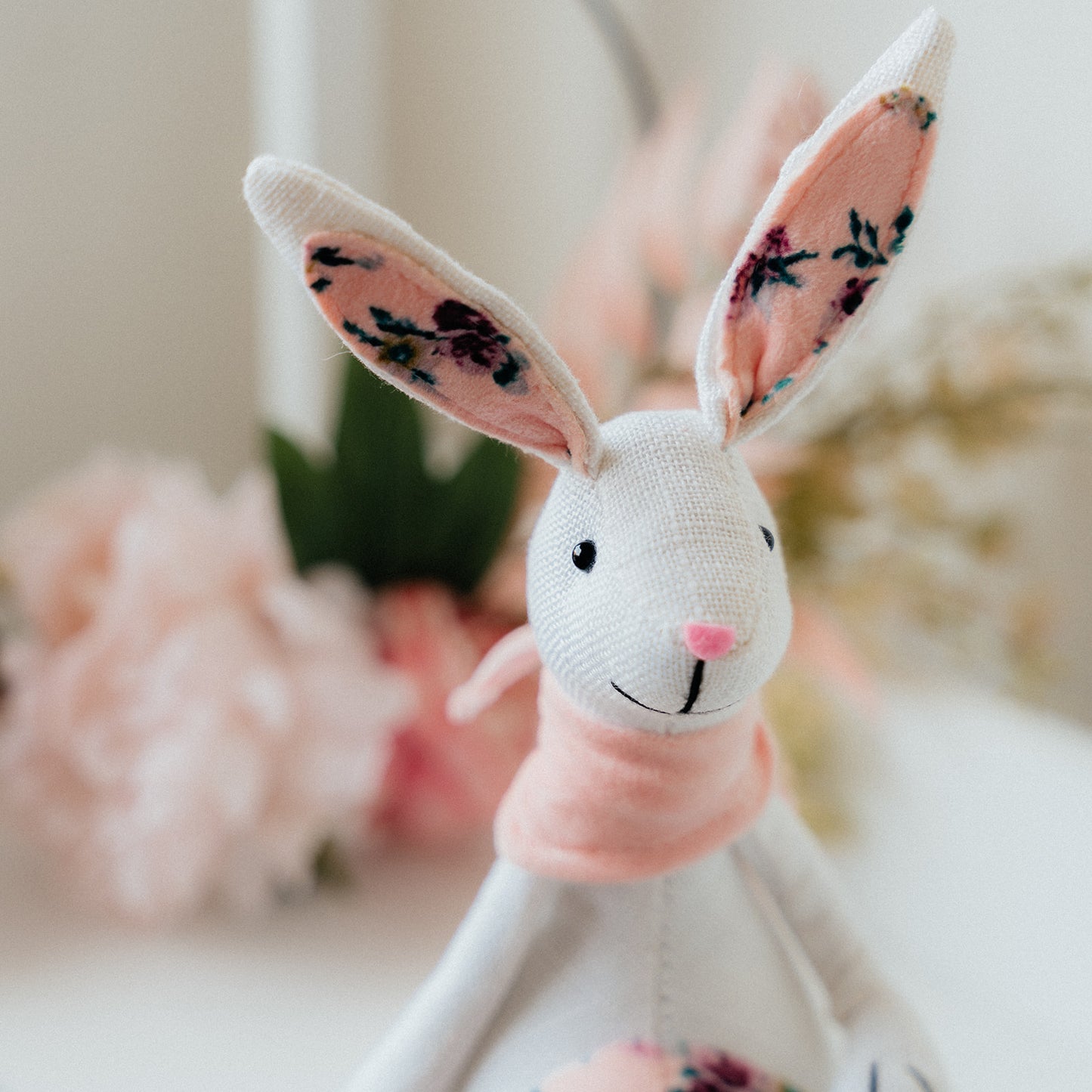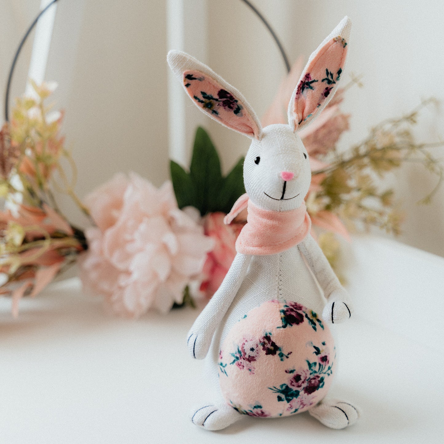 This adorable Bunny brings smiles to everyone. She looks so sweet with the little scarf wrapped around her neck and with pretty blue flower fabric on her round tummy and in his ears