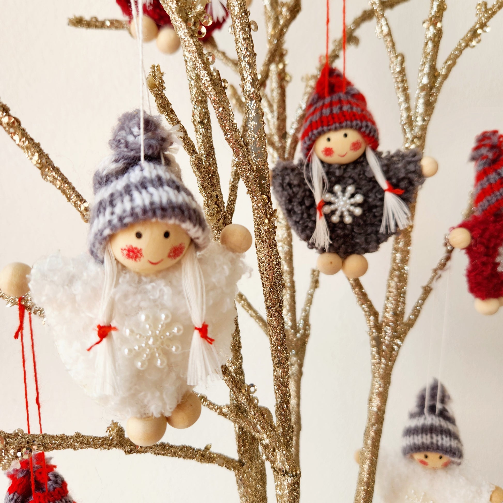 Decorate your home with these pretty hanging Christmas dolls. Perfect for adding a festive touch to your tree or decorative branches. They also make lovely extras when tied to gifts or napkins on your Christmas table. A sweet and thoughtful detail for the holiday season.